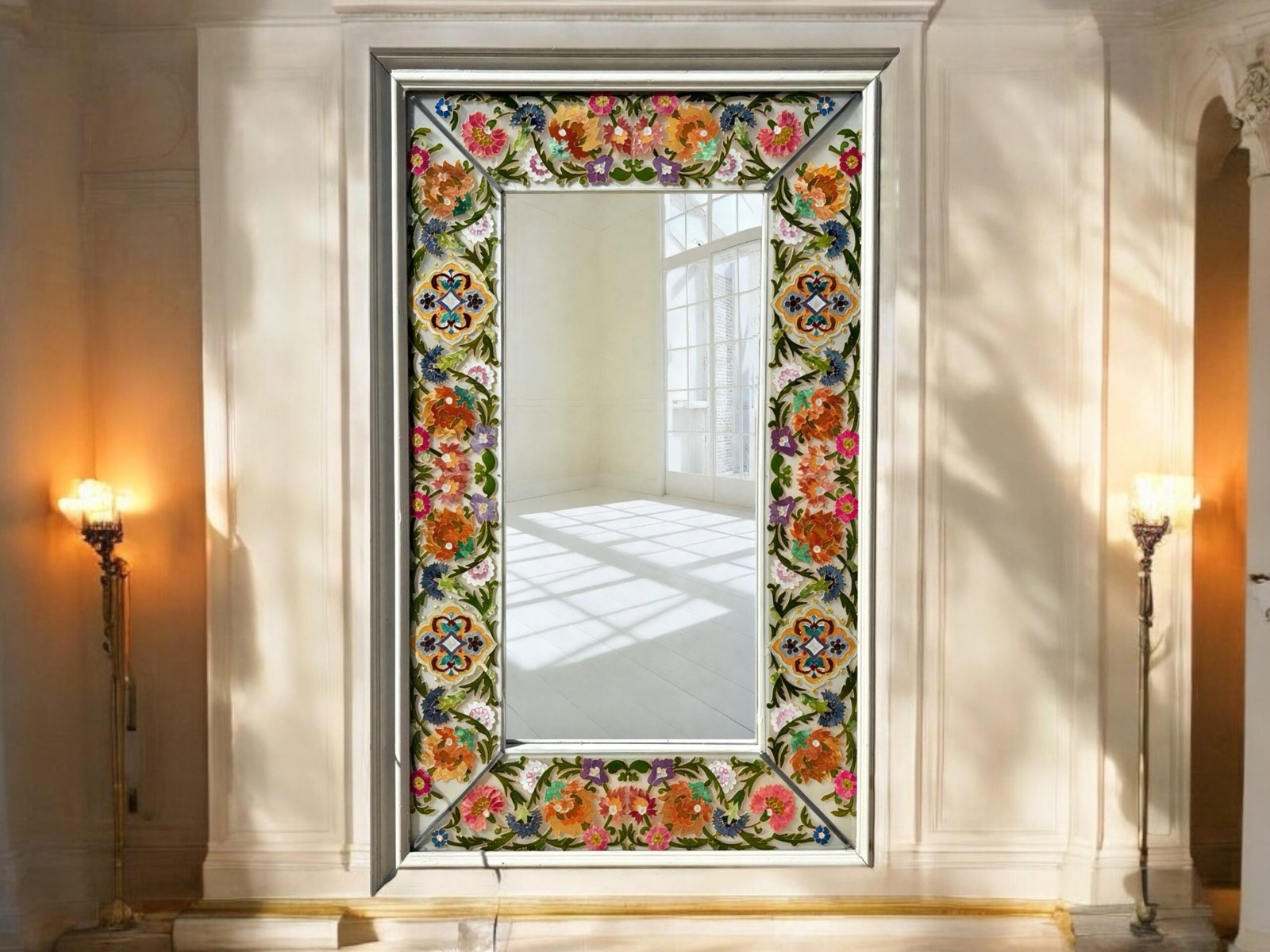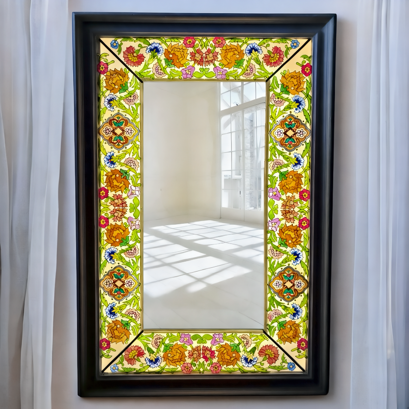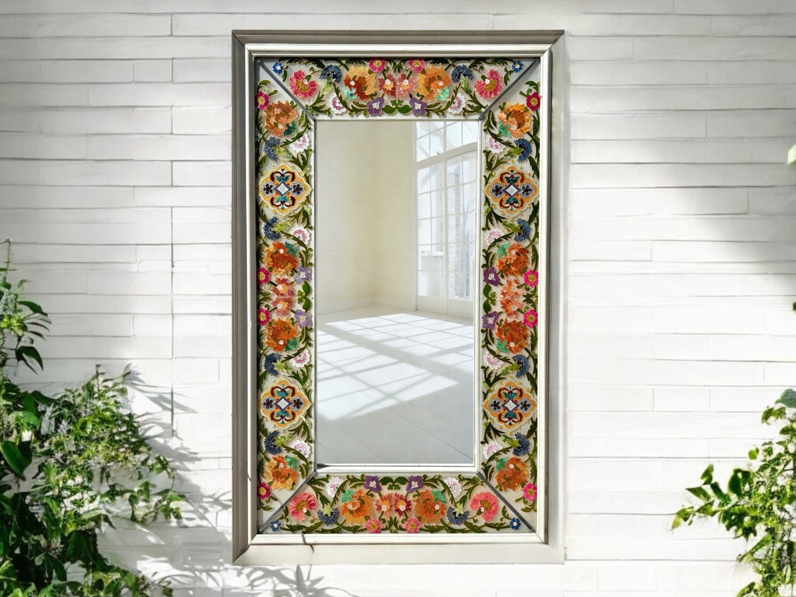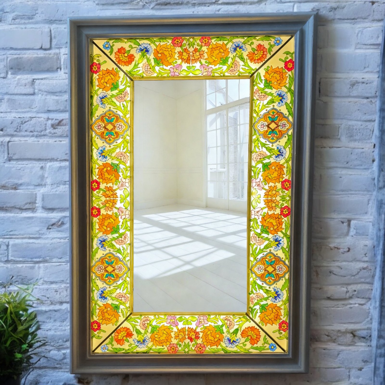 Ένας ζωγραφισμένος στο χέρι καθρέφτης τοίχου με βιτρό. Διαθέτει ξύλινο εξωτερικό σκελετό καθώς και γυάλινο σκελετό ζωγραφισμένο στο χέρι που περιβάλλει τον καθρέφτη. Μπορεί να κρεμαστεί είτε κάθετα είτε οριζόντια. Η λωρίδα led μπορεί να αλλάξει εάν είναι απαραίτητο ξεβιδώνοντας τέσσερις βίδες στο πίσω μέρος του καθρέφτη. Μπορεί να χρησιμοποιηθεί είτε αναμμένο (υπάρχει ένας μικρός διακόπτης στο πλάι), είτε χωρίς φωτισμό, εξίσου όμορφο σε φυσικό φως. Μπορεί να καθαριστεί με απλή οικιακή χρήση σπρέι γυαλιού/καθρέφτη, χωρίς υπερβολικό τρίψιμο. Διασταση: 60χ90χ3