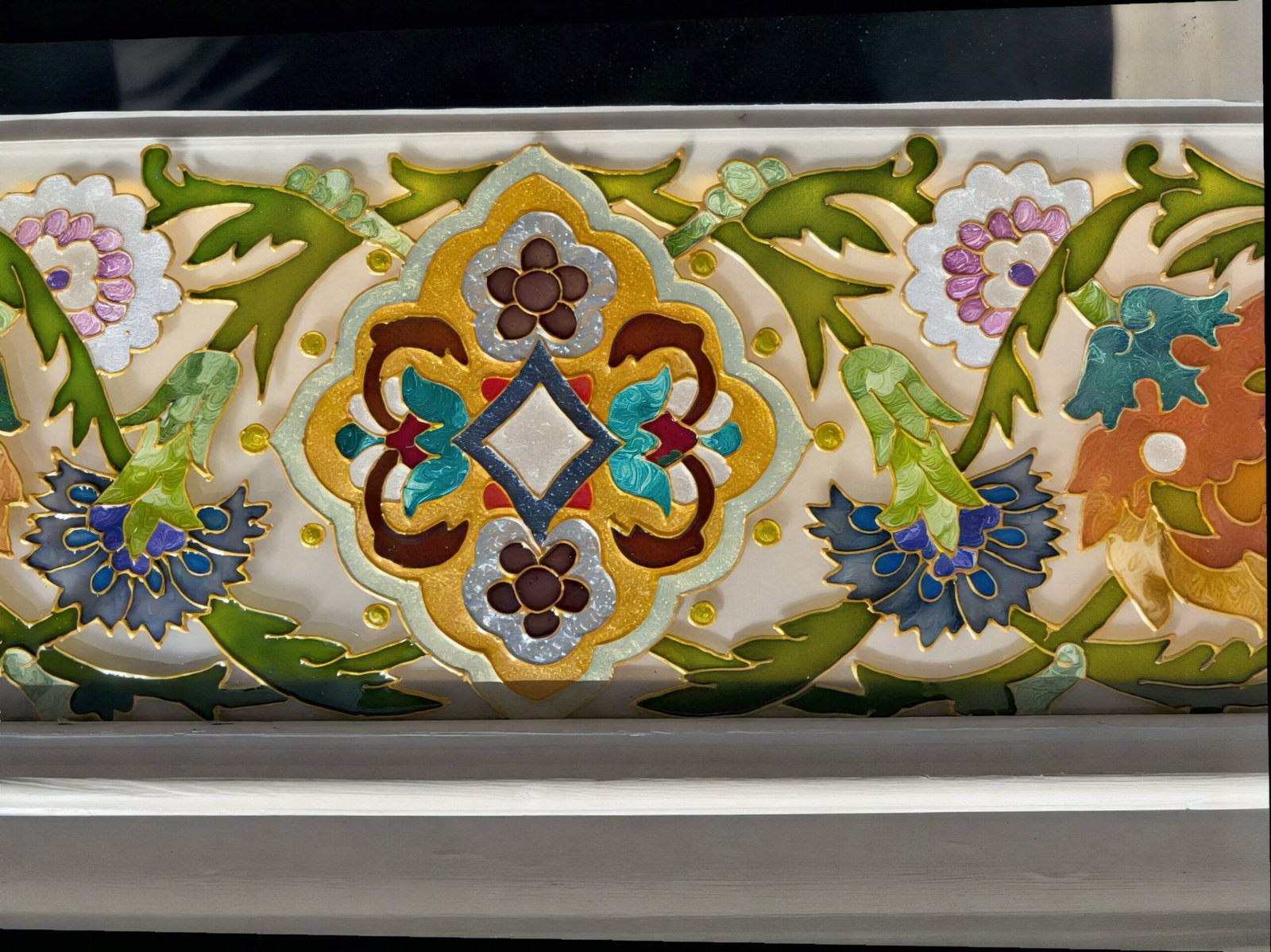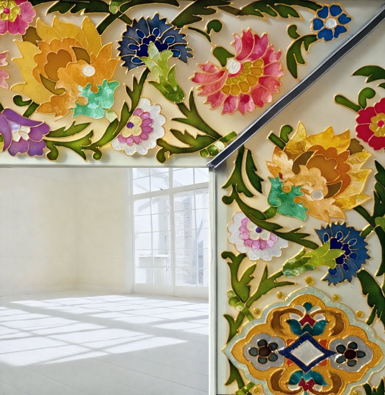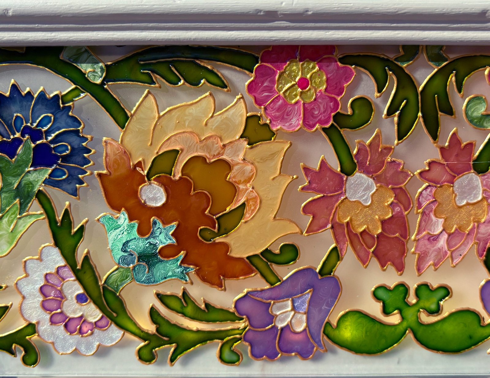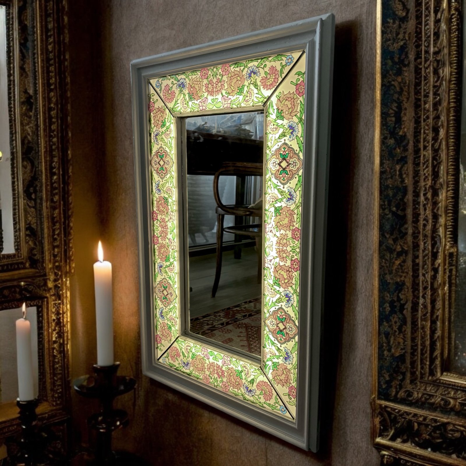 Ένας ζωγραφισμένος στο χέρι καθρέφτης τοίχου με βιτρό. Διαθέτει ξύλινο εξωτερικό σκελετό καθώς και γυάλινο σκελετό ζωγραφισμένο στο χέρι που περιβάλλει τον καθρέφτη. Μπορεί να κρεμαστεί είτε κάθετα είτε οριζόντια. Η λωρίδα led μπορεί να αλλάξει εάν είναι απαραίτητο ξεβιδώνοντας τέσσερις βίδες στο πίσω μέρος του καθρέφτη. Μπορεί να χρησιμοποιηθεί είτε αναμμένο (υπάρχει ένας μικρός διακόπτης στο πλάι), είτε χωρίς φωτισμό, εξίσου όμορφο σε φυσικό φως. Μπορεί να καθαριστεί με απλή οικιακή χρήση σπρέι γυαλιού/καθρέφτη, χωρίς υπερβολικό τρίψιμο. Διασταση: 60χ90χ3